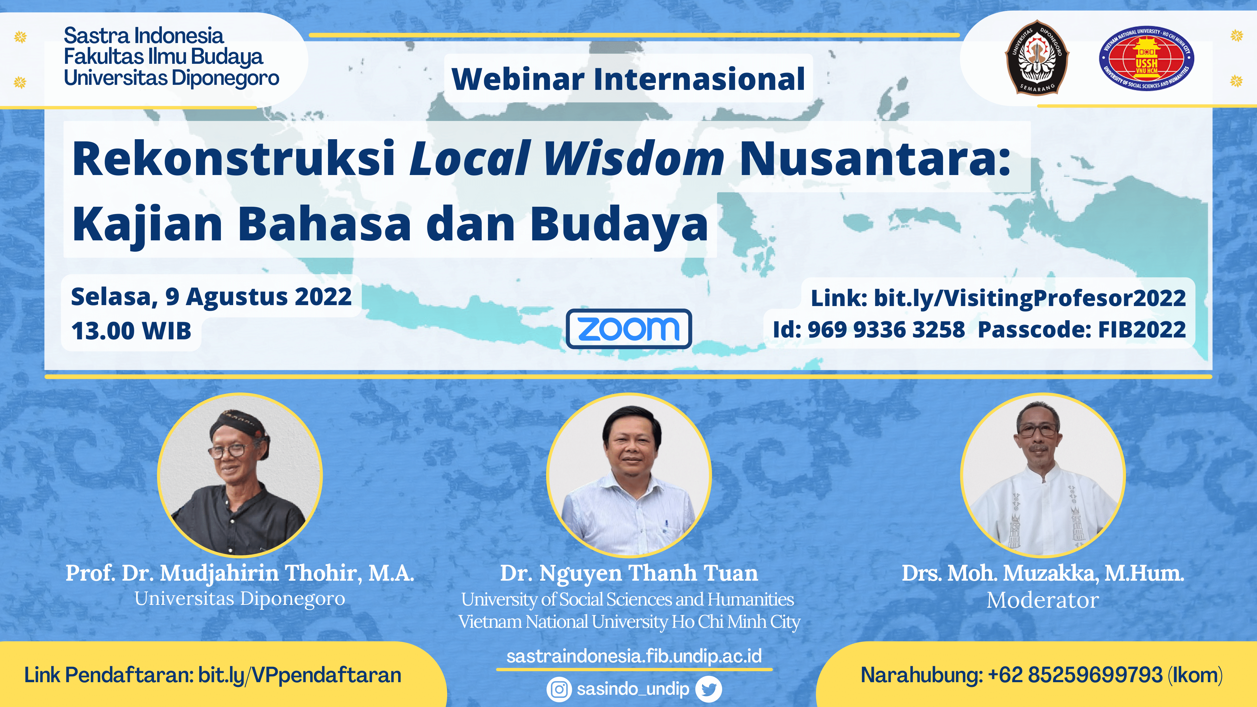 Program Studi Sastra Indonesia FIB Undip menyelenggarakan webinar internasional dengan tema Rekonstruksi Local Wisdom Nusantara: Kajian Bahasa dan Budaya. Webinar ini diselenggarakan sebagai upaya merekonstruksi kearifan lokal Nusantara untuk menghadapi derasnya laju perubahan yang terjadi pada bahasa dan budaya dekade ini. Mari bergabung dalam webinar kali ini yang akan diselenggarakan melalui zoom meeting pada hari Selasa, 9 Agustus 2022 pukul 13.00 WIB.